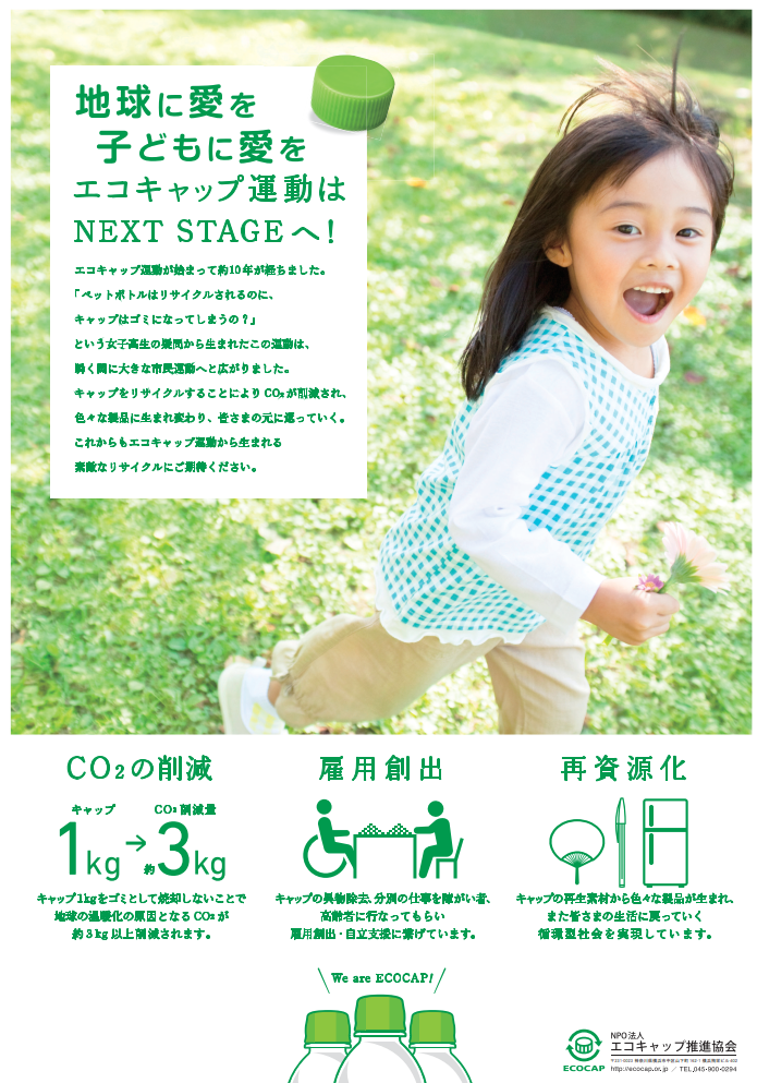 | NPO法人エコキャップ推進協会を通じてご提供いただいたエコキャップを活用していただきます。同協会のエコキャップ運動の目的は、リサイクルの促進、CO2の削減、売却益で発展途上国の医療支援に加えて、障がい者や高齢者の雇用促進という4つがあります。 皆様のご協力、心から感謝申し上げます。 |